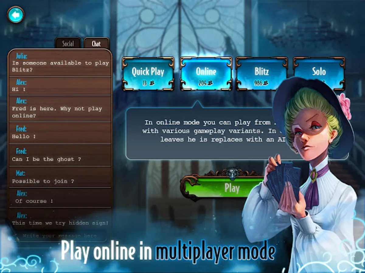 Mysterium is a cooperative deduction game set in the 1920s in which a ghost guides a group of psychics to uncover a murderer, as well as the weapon and location of the murder, using only visual clues. Choose your way to play: take on the role of the ghost who gives others clues, or as one of the psychics trying to decipher the abstract "Vision Cards".