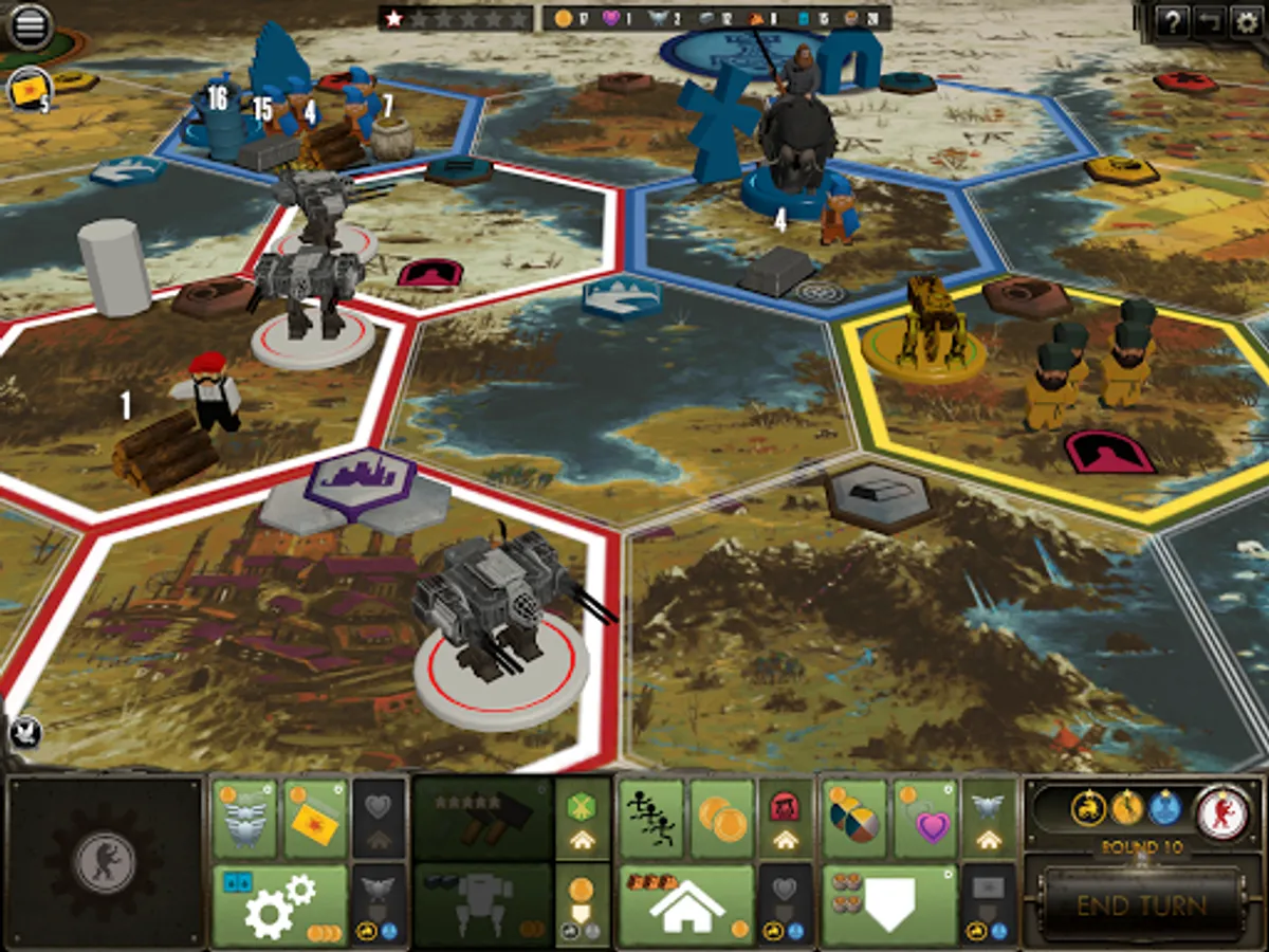 • Engine Building: Players can improve their construction abilities to become more efficient, build structures that improve their position on the map, enlist new recruits into their faction, activate mechs to dissuade opponents from invading and expand their borders to reap greater types and quantities of resources. This aspect creates a feeling of energy and progression over the course of the entire game. The order in which players get to develop their economy and technologies adds to the unique feel of every game, even when playing as the same faction several times.