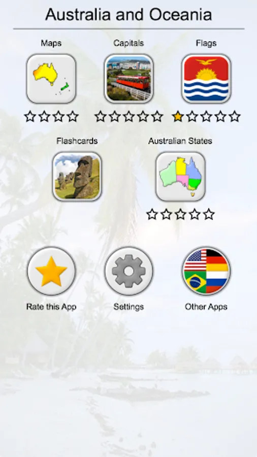 There are separate levels to study the location of countries and states on the maps and to guess their flags and capitals.