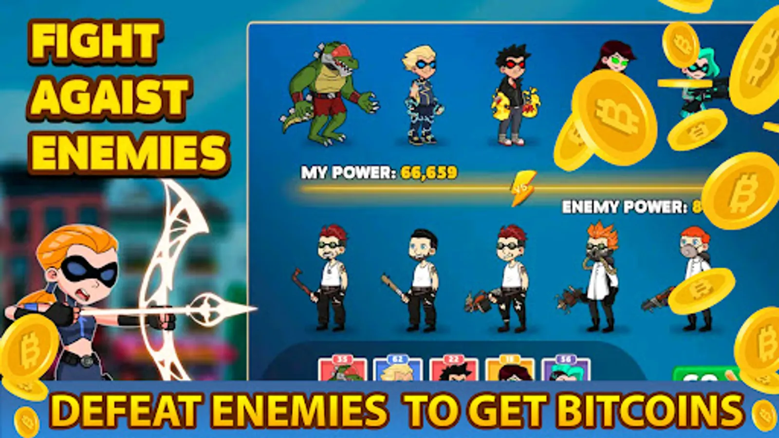 Engage in thrilling, action-packed battles against formidable opponents in diverse arenas. Show off your skills, execute powerful combos, and dominate the battlefield. The more fights you win, the more Bitcoin you can earn! Prepare for an adrenaline-fueled brawl like never before.