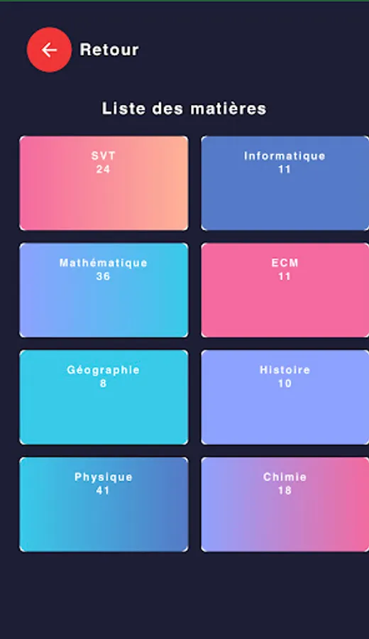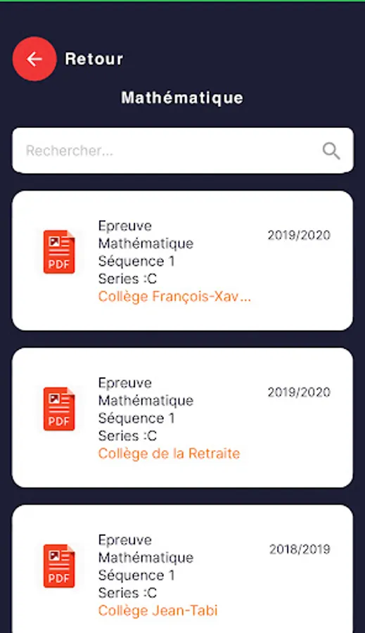 Our goal is to facilitate access to the tests for students in classes from 3ème to Terminale. It will therefore give you access to the Examination tests (BEPC, PROBATORY, BACCALAUREAT) for all series.
