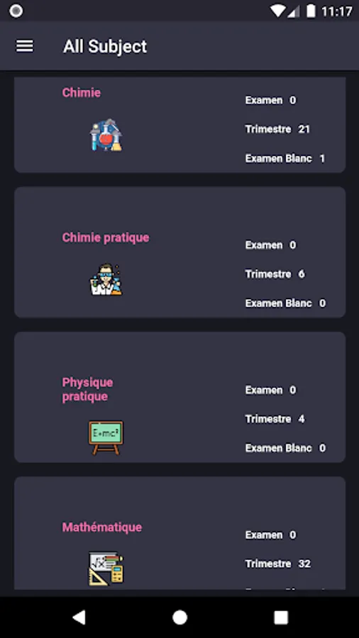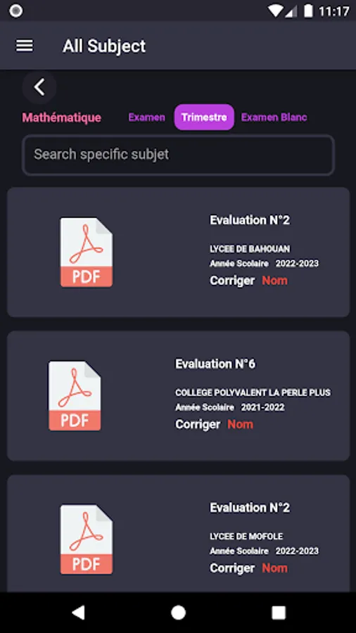Our objective is to facilitate access to the tests for students in classes from 3rd to 12th grade. It will therefore give you access to the Examination tests (BEPC, PROBATORY, BACCALAUREAT) for all series.