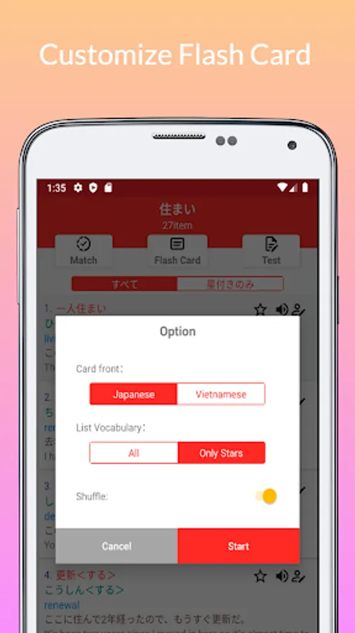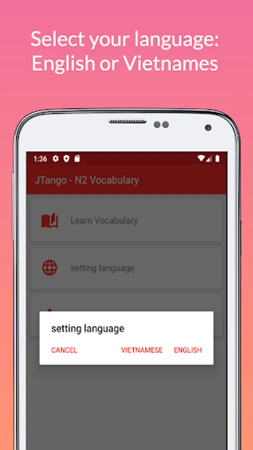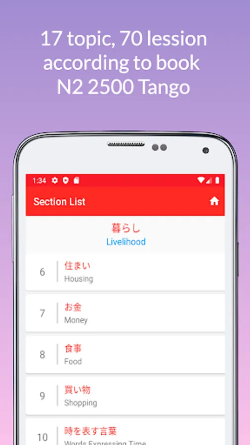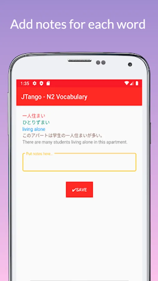 Japanese language learning app JTango N2 Tango 2500 with JLPT N2 Vocabulary from book は じ め て の 日本語 能力 試 験 N2 単 語 2500 (2500 Essential Vocabulary for the JLPT N2) (2500 tango N2).