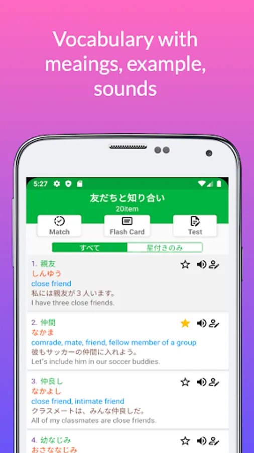 - Each word has examples, example explanations, sounds, and automatic transitions of currently playing words. A note can be added for each word.