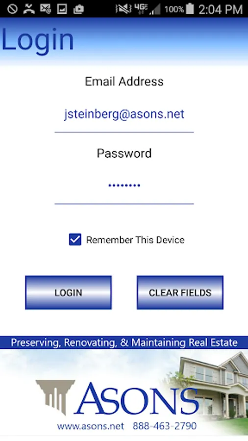 A mobile version of the Asons Construction Contractor Portal that allows viewing, managing, and completion of work orders. A valid Asons Construction Contractor Portal email address and password is required.
