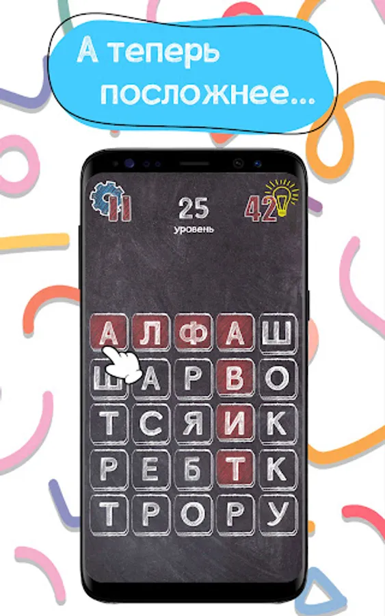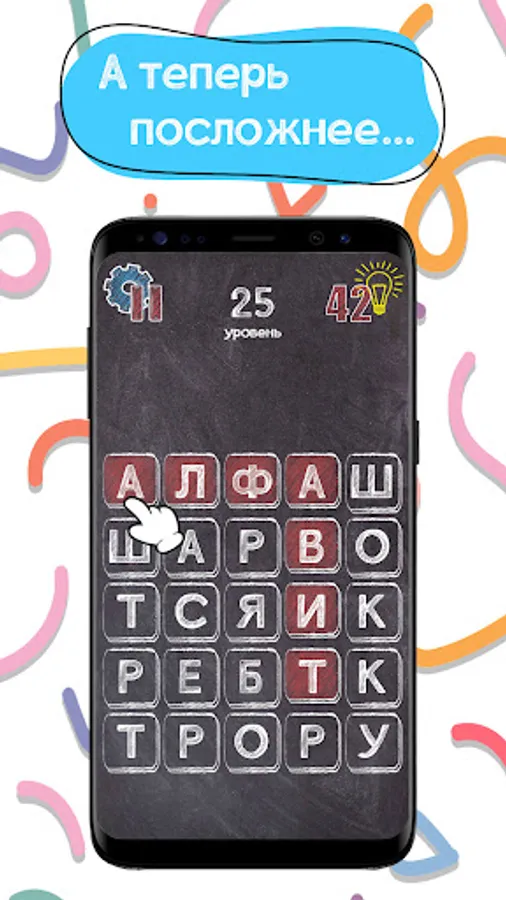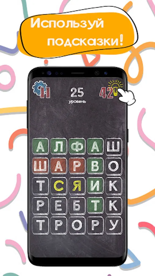 There is a square field filled with letters. Search for words and highlight them by swiping your finger across the screen, just like in classic fillwords and Hungarian crosswords