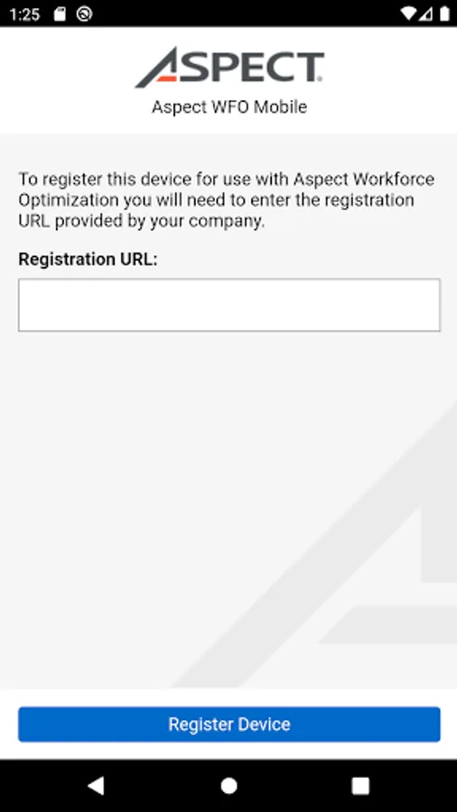To register this device for use with Aspect Workforce Optimization you will need to enter the registration URL provided by your company.