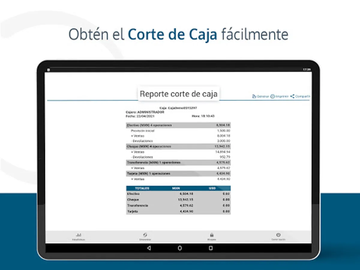 • Obtain cash cutoff and cash settlement reports at any time of the day, separated by payment methods.