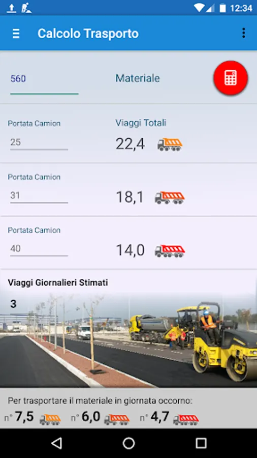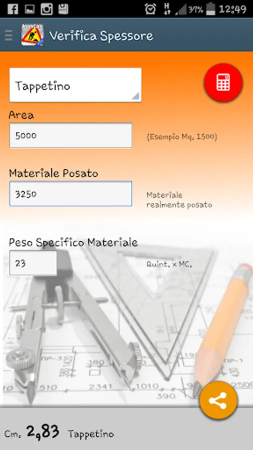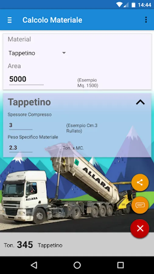 * After entering the area to pave the type of material and thickness, AsphCalc calculates Tons necessary to perform the work ....