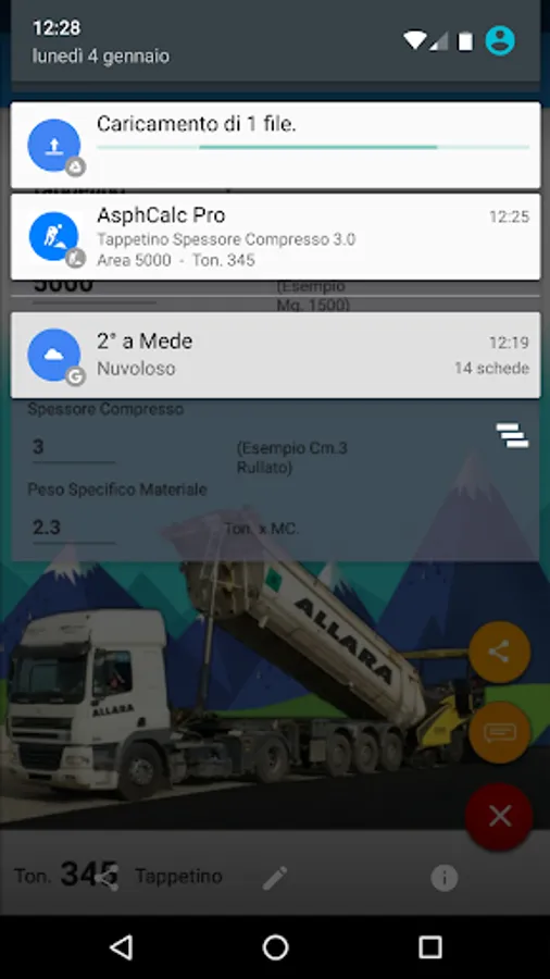 - New Work in Progress, allows to calculate the theoretical length of the stretched, ideal for controlling the shipyard in processing, just enter the weight and the type of material (see transport bubble) the width of the paving to be laid and AsphCalcPro calculate the length that you will have to catch up with the thickness of your choice, while avoiding thicknesses at the end of processing problems
