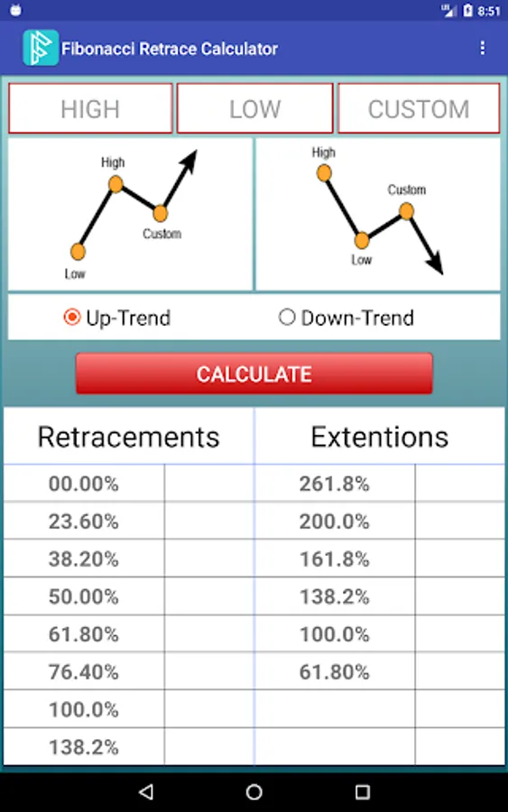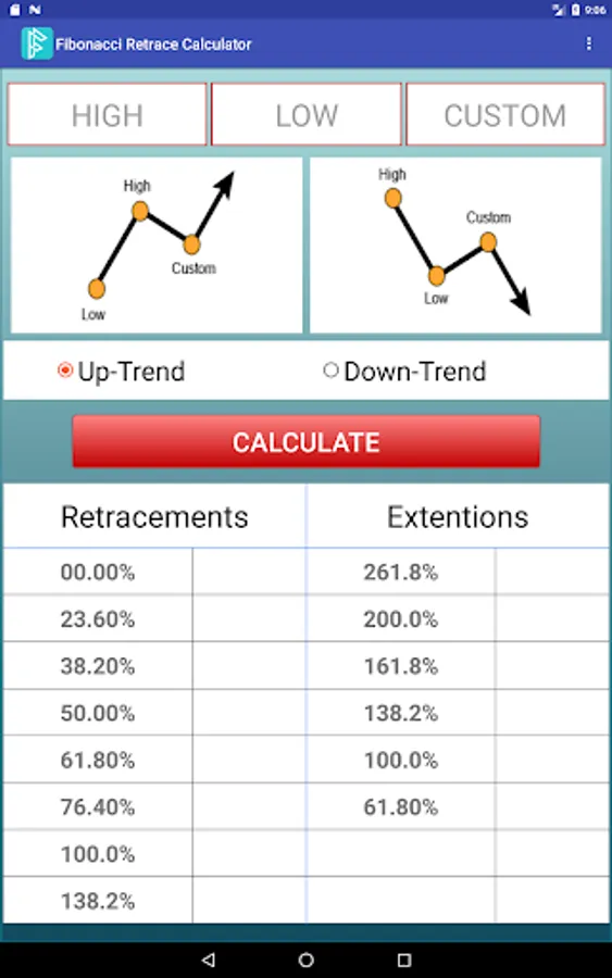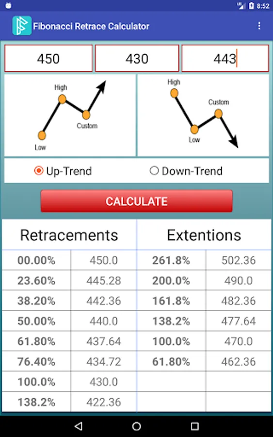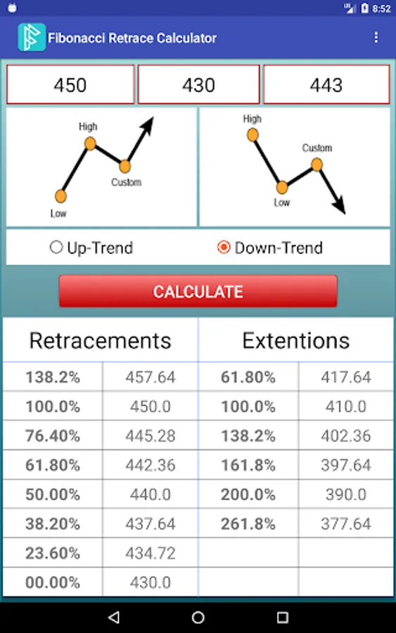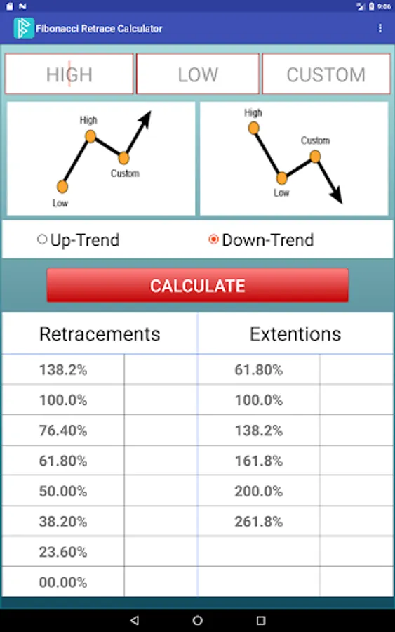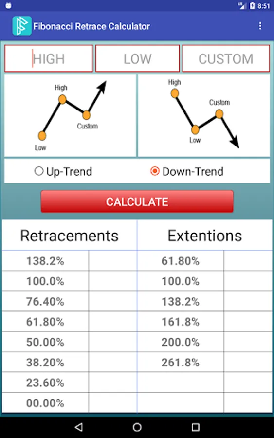 This calculator application is to help stock or forex traders in trading to determine the key levels of Fibonacci retracement or Fibonacci extensions / expansion by input high, low and custom values.