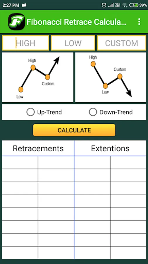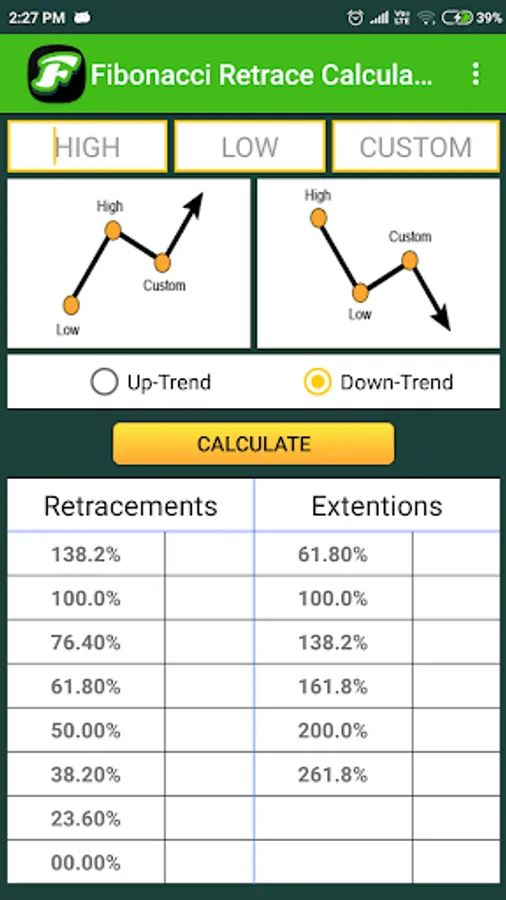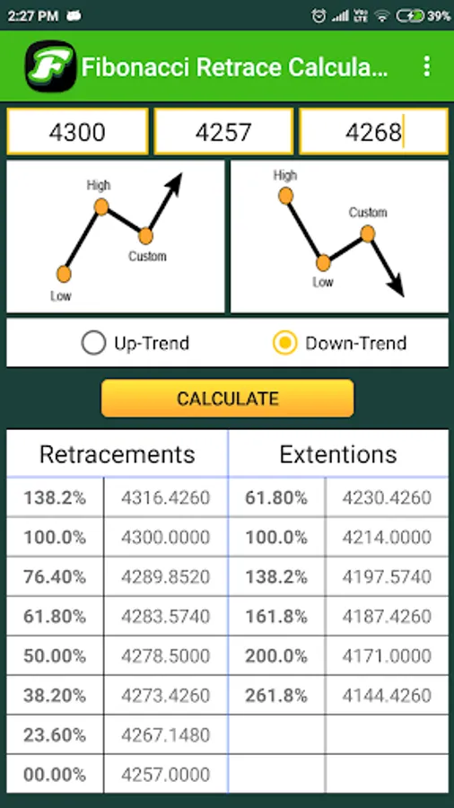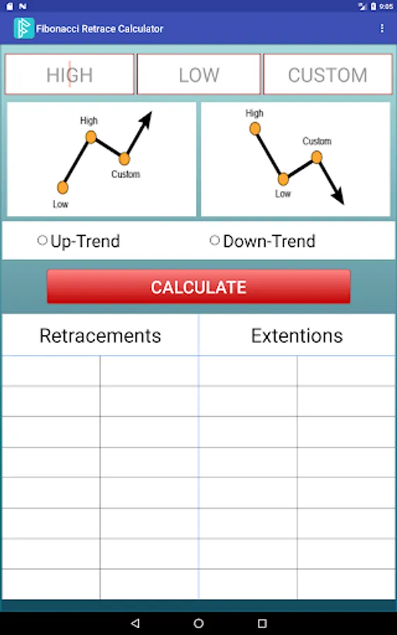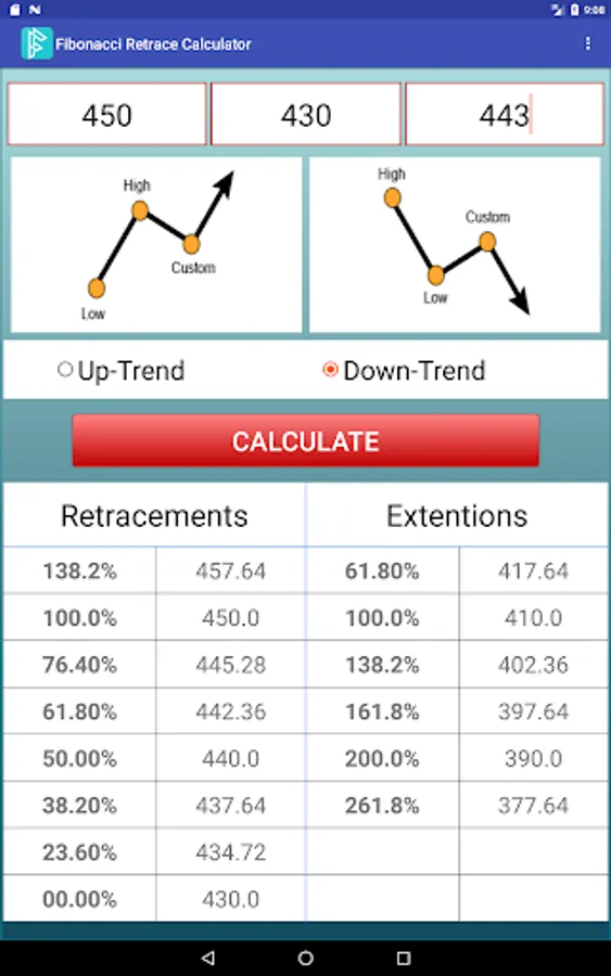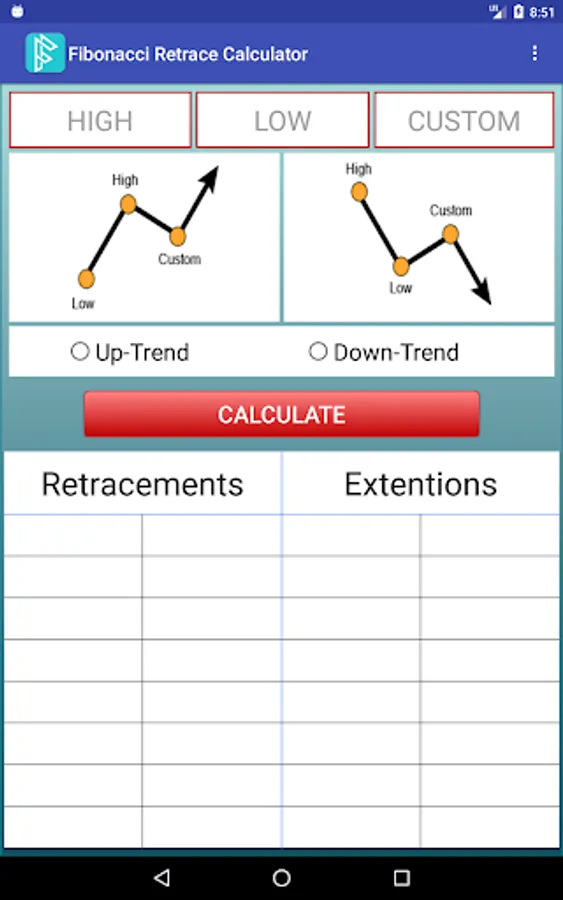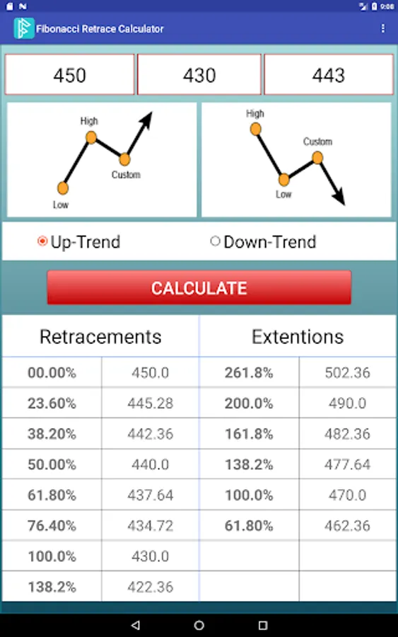 This calculator application is to help stock or forex traders in trading to determine the key levels of Fibonacci retracement or Fibonacci extensions / expansion by input high, low and custom values.