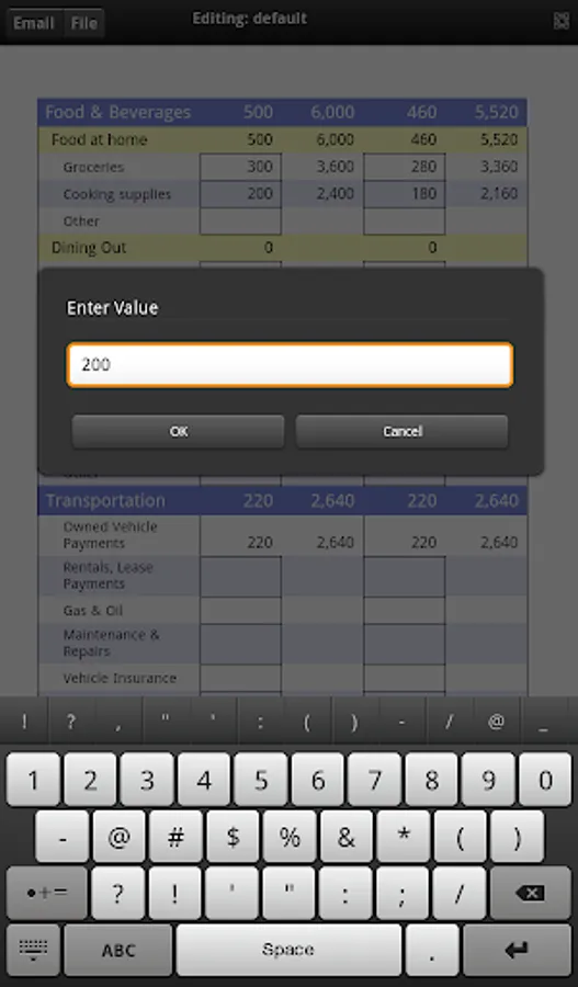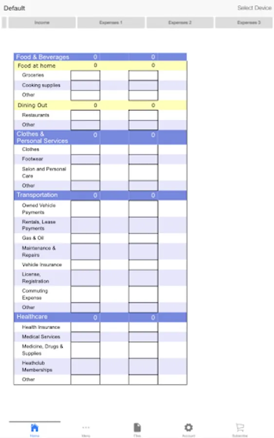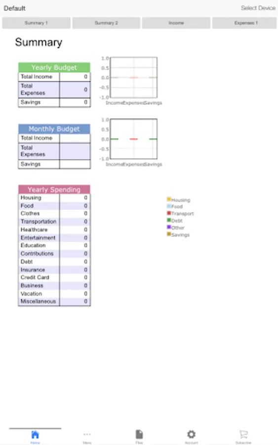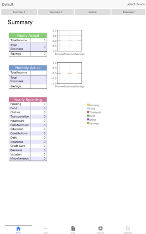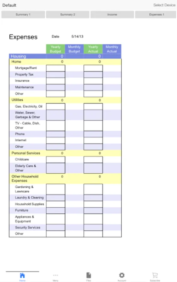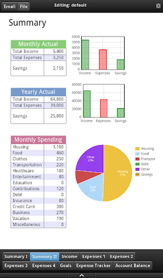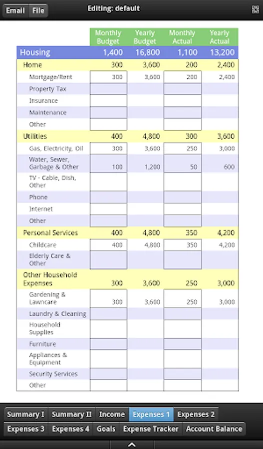 Budgeting: Create the budgeted entries for your income and expenses including but not limited to housing, food, transportation, clothes and personal services, healthcare, entertainment, education, contributions and debt payments, and their sub-categories, on a monthly and yearly basis. Enter the actual entries for your yearly expenses and compare it with the corresponding budgeted entries. Get the average budgeted yearly values with respect to your monthly entries.