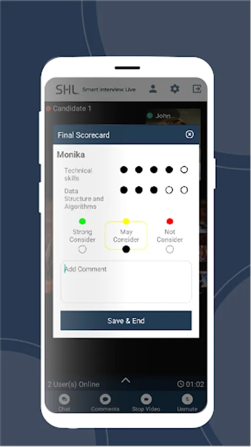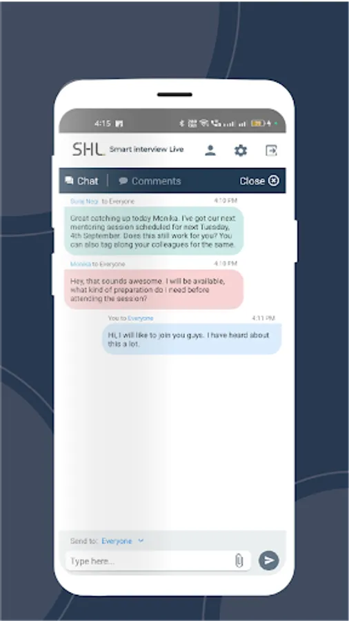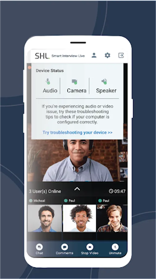 We provide a collaborative environment using audio-video conferencing and chat. Interviewers and candidates can download the app and join interviews using the interview link that they receive.