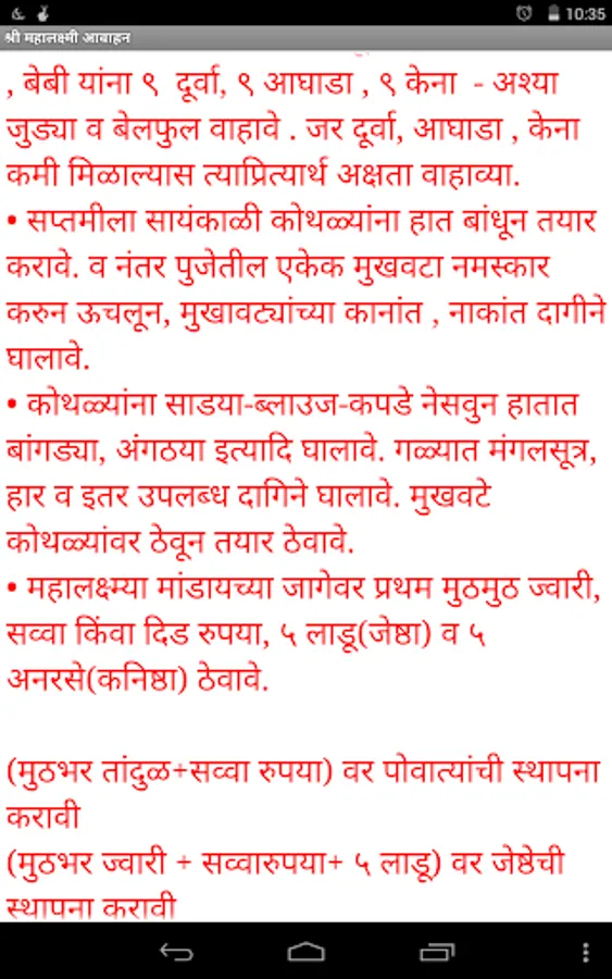 This app explains the daywise pujan of Shri Mahalaxmi from Gauri 'Awahan' (सप्तमीi), Gauri 'Pujan' (अष्टमी), to Gauri Visarjan (नवमी).