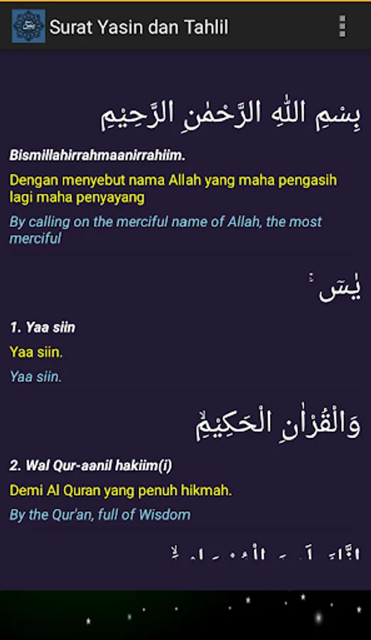 Surah Yasin and Tahlil are accompanied by their translations.