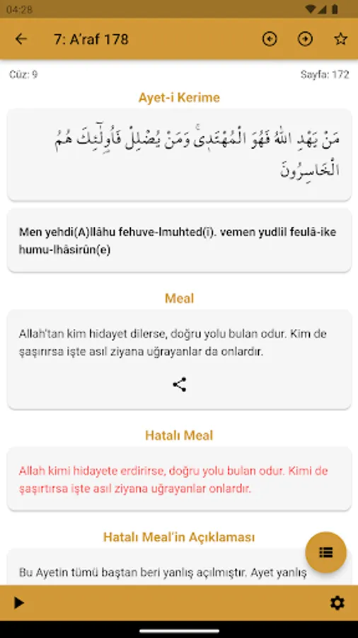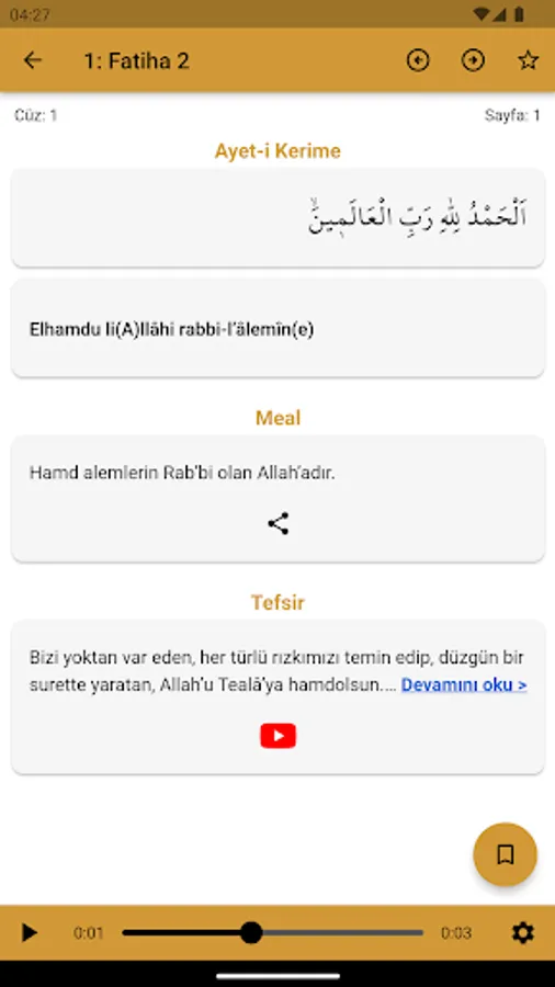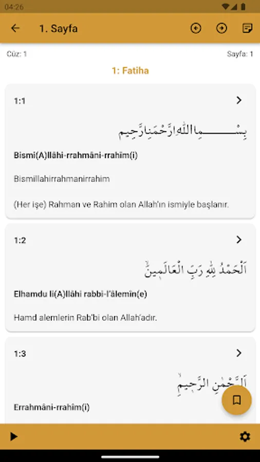 You can easily follow the Arabic, translations and interpretations of the verses on a single screen. You can save where you left off and continue later.