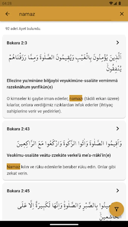 You can search for any word you want to find in the Quran; such as 'prayer' and 'fasting'. All the verses containing the word you are looking for will be listed instantly. You can also search the Arabic of the verses with Latin letters.