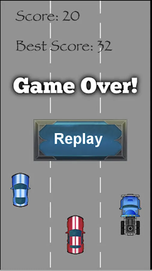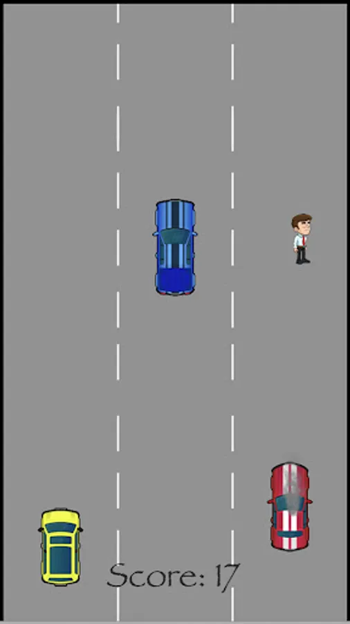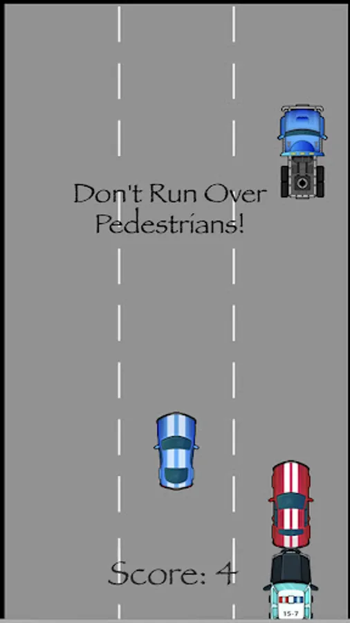 A car game in which you must avoid the other cars on the road as well as the pedestrians. If you hit 3 cars its game over! If you hit a pedestrian the police will come after you. You can try to avoid the police by quickly changing lanes if you can, but otherwise its game over!