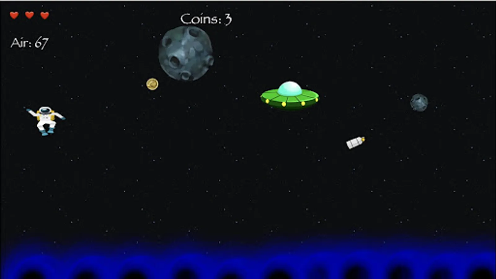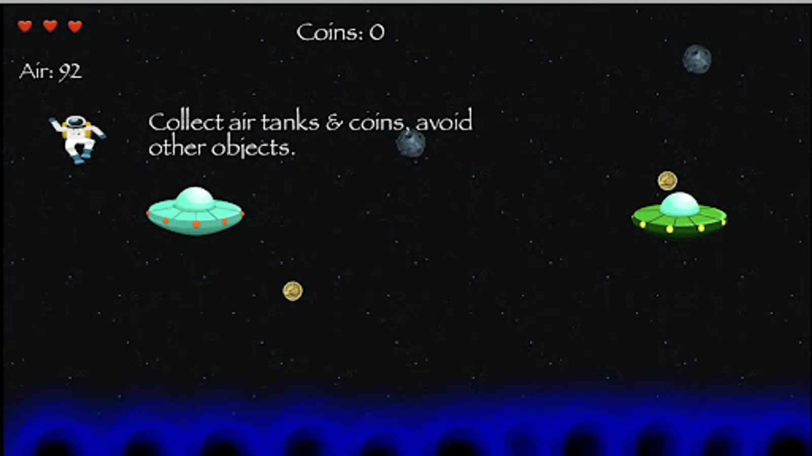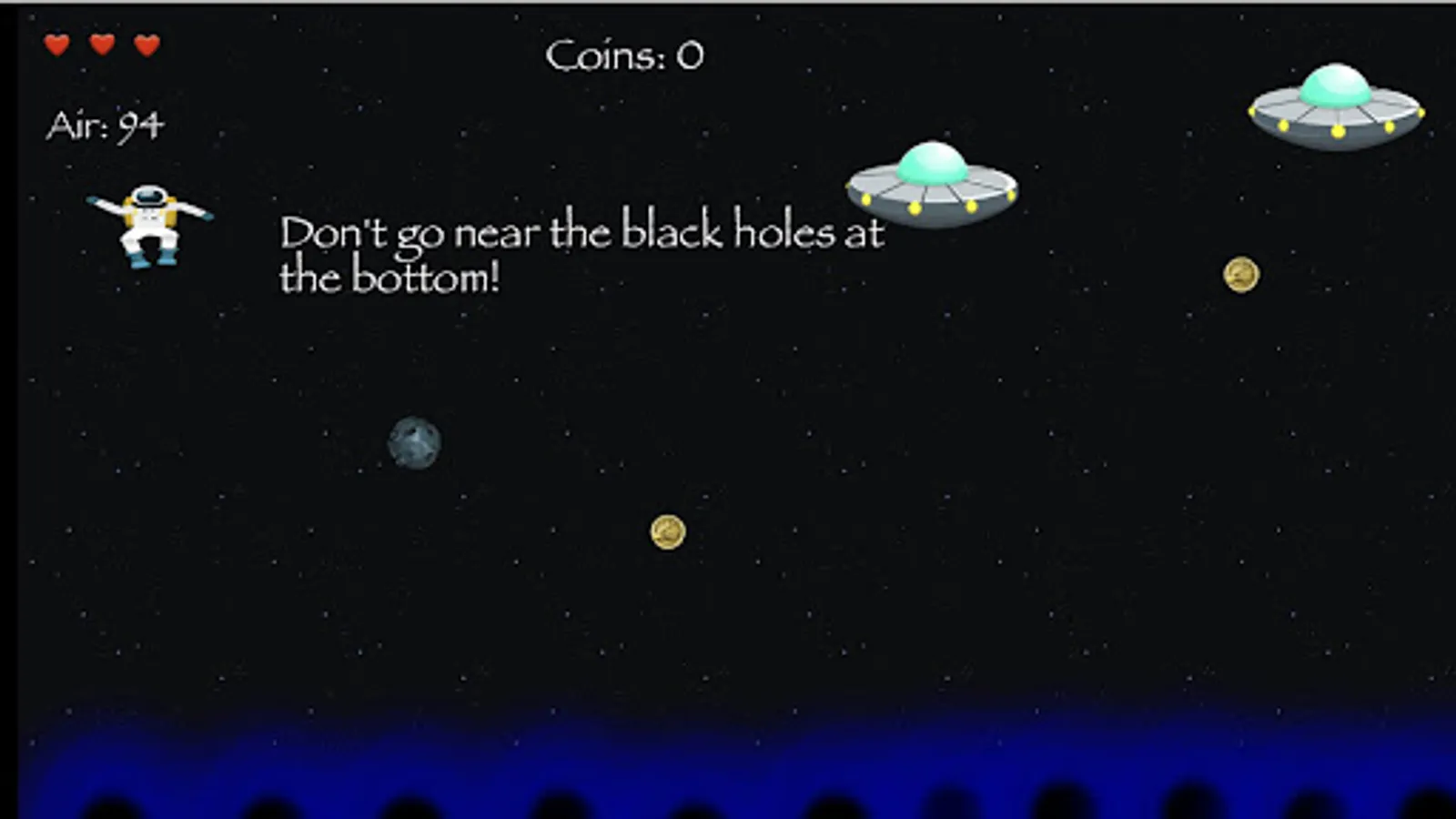 You are an astronaut and were on a spaceship transporting some gold when you and most of your cargo were suddenly ejected into space. This left you careening through space. Collect air tanks so you dont run out of air and also collect the gold coins. Avoid all other objects, especially the black holes at the bottom of the game screen.