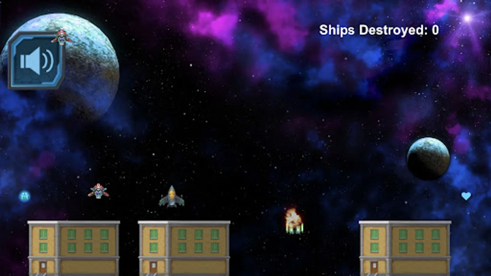 Save from Aliens III is a space shooter game. Aliens in spaceships are descending down upon Earth. You have been tasked to fly your spaceship and protect Earth by shooting down the alien ships. Specifically your task to is to protect the 4 buildings on Earth from the aliens. Each time the buildings take a hit they are damaged and become more transparent. Likewise each time your ship takes a hit it becomes more transparent. When your spaceship takes too many hits it will be destroyed.