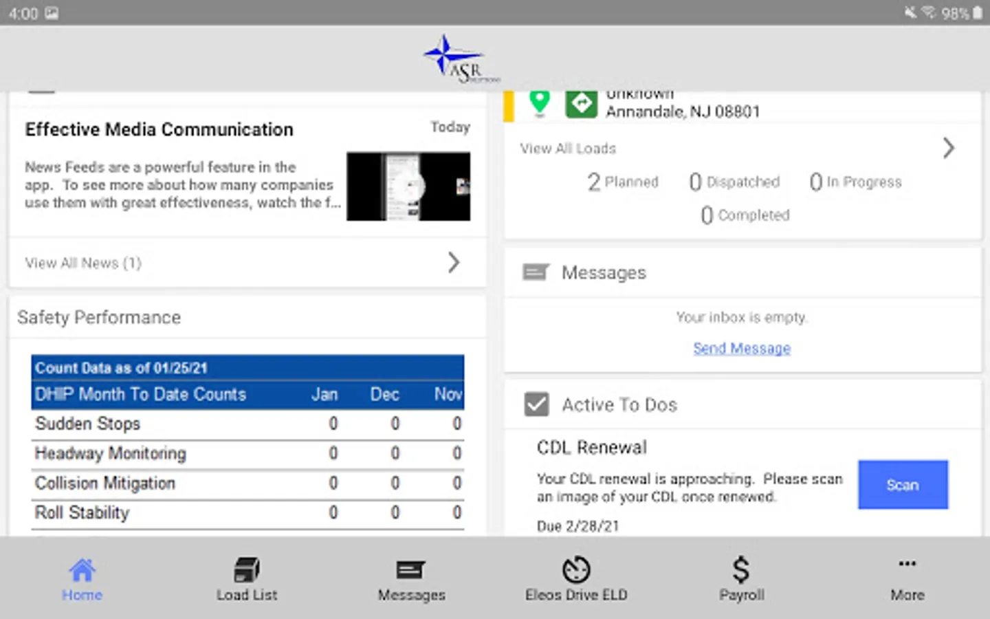 The ASR Solutions Mobile application was designed in support of our Dedicated Clients, Staff, and the Transportation Community at large. You can do many things with this app: view load and stop detail, view maps, send & receive messages, scan & send documents, view news, report safety issues, and much more.