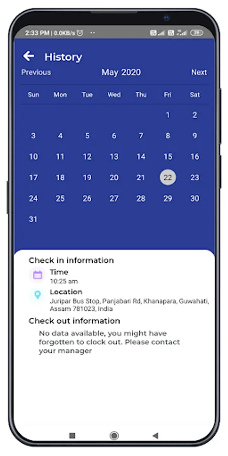 - False attendance marked can be recognized (if any employee change any details on their phone while marking their attendance, it is automatically detected by admin)