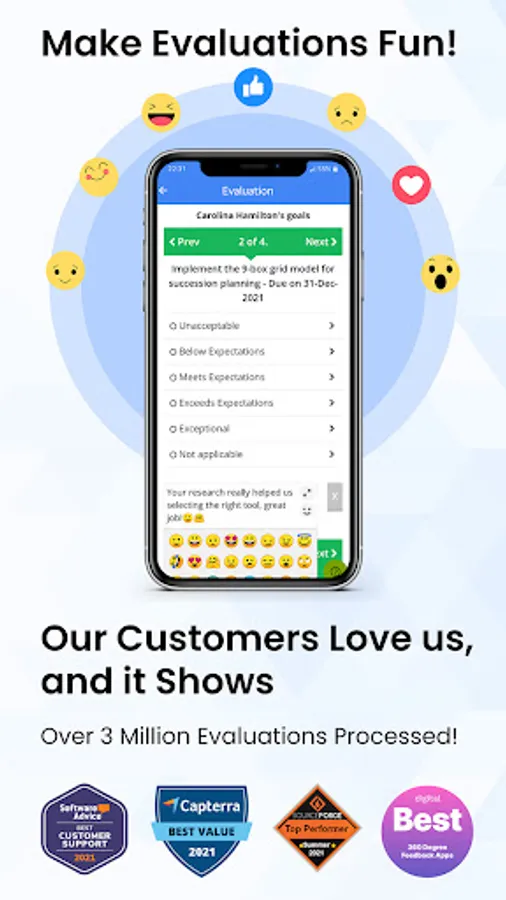 360-degree feedback, customer satisfaction surveys, real-time feedback, continuous feedback, traditional top-down performance reviews, and project performance evaluations, we support every popular evaluation methodology.