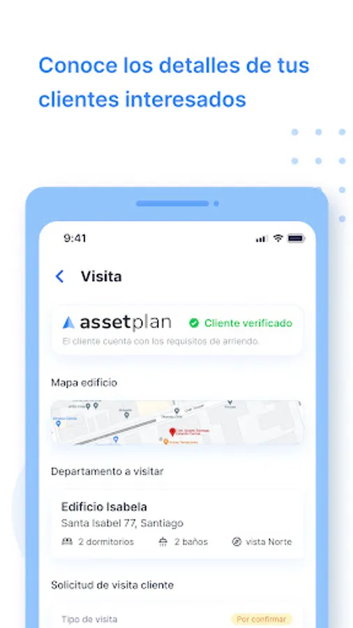 Tool for Assetplan brokers that helps to centralize the management of their clients, allowing the registration and monitoring of their applications and visits to departments.