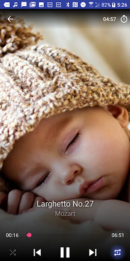 The app has timer, you can set it and go to sleep, the music will be stopped automatically. The app has shuffle mode to play music in random order and repeat mode to play the same song again automatically.