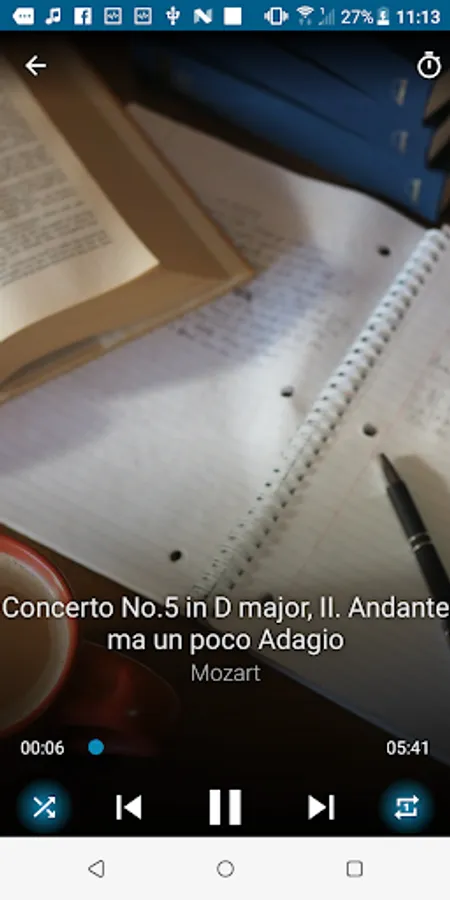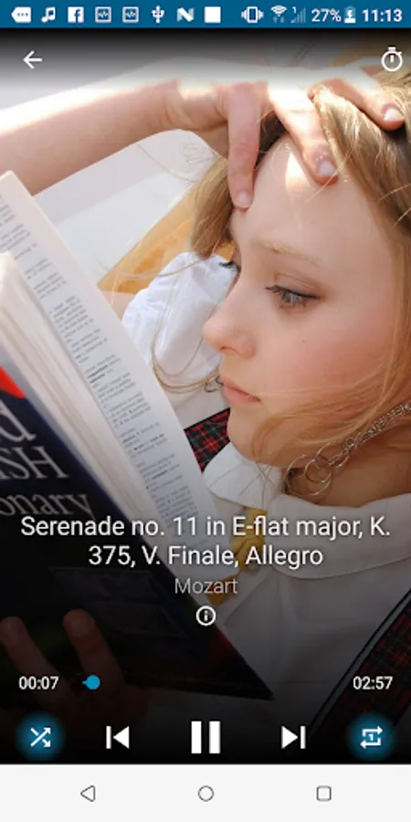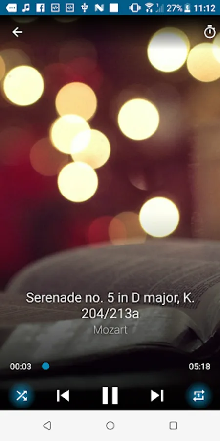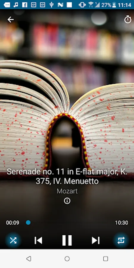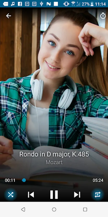 The app has timer, you can set it and go to sleep, the music will be stopped automatically. The app has shuffle mode to play music in random order and repeat mode to play the same song again automatically.