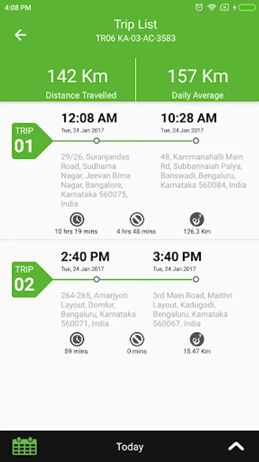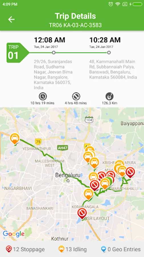 You can track all the trips made by the vehicle graphically on the map. Information such as kilometers travelled, stoppages, idling, engine time and average speed is displayed. Overspeeding and overdrive stretches are highlighted on the map. Option to replay the entire trip is provided with option to check the trips for older dates.