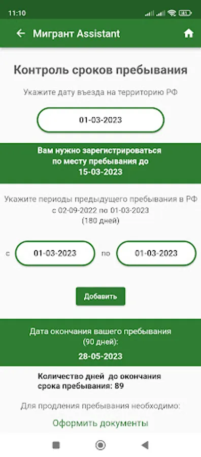 - The algorithm of the program, based on the entered data, will determine the possibility for a foreign citizen to obtain permits, on the basis of which he will be able to extend his stay on the territory of the Russian Federation in accordance with the requirements of the migration legislation of the Russian Federation.