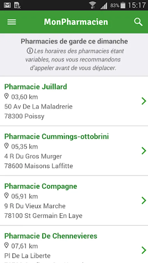 With the MyPharmacist application, you can search on weekdays, Sundays and public holidays, the pharmacies available around the desired location. You can thus identify the pharmacy closest to you and easily find the best route to get there. At night, pharmacies 24/24 are directly accessible (example: Paris). Everywhere else, the contact details of the emergency pharmacy will be communicated to you by the local police or gendarmerie.
