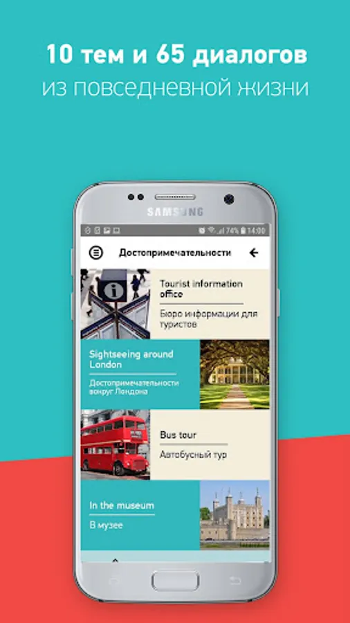 - 10 of the most popular topics: Welcome and introductions; Transport; Accommodation; The café and restaurant; Sights; Entertainment; Purchases; Communications; Health; The bank and the police.