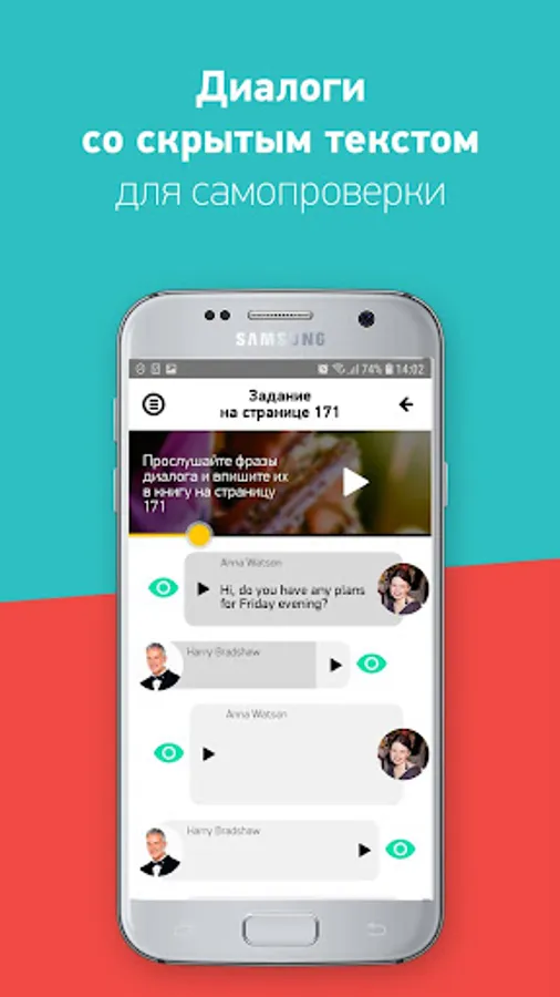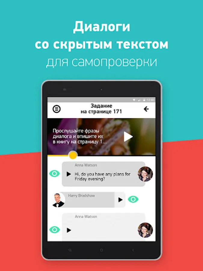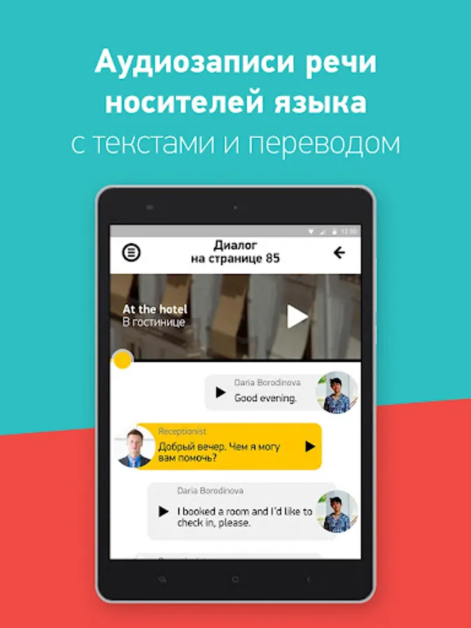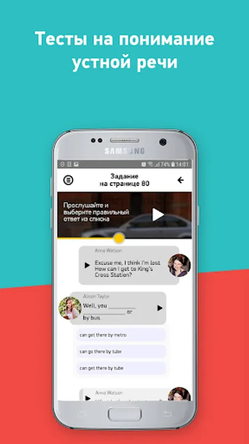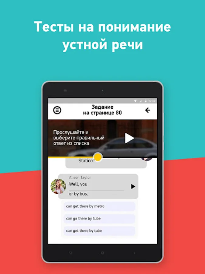 The application includes a dialogue with the Russian translation read by native speakers, as well as exercises on both listening.