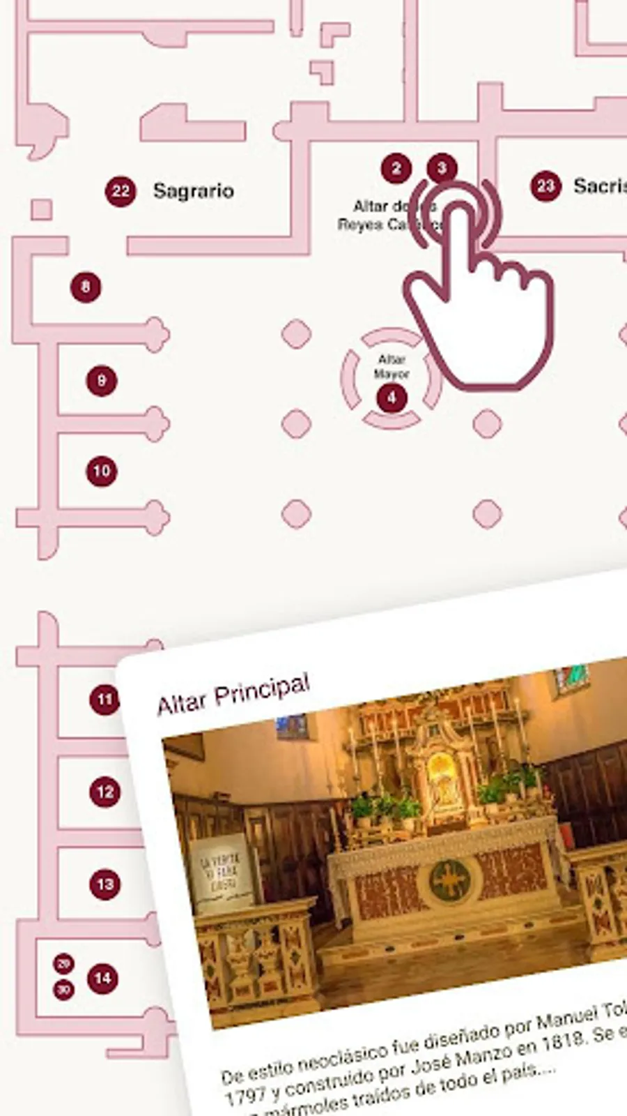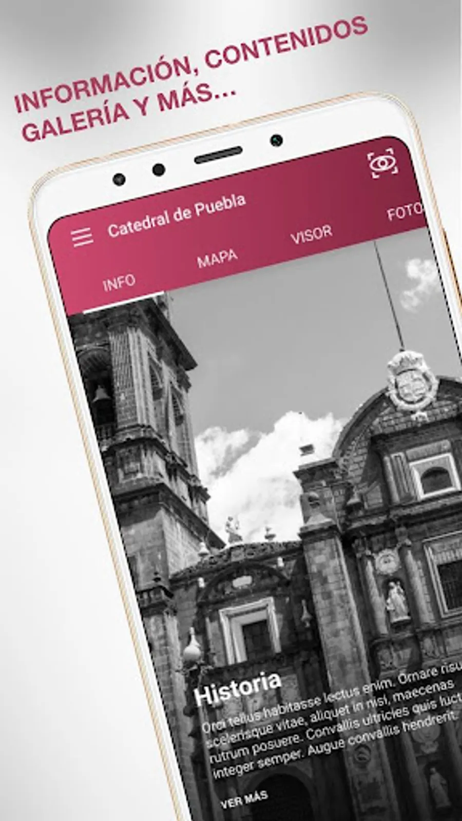 Application to know the Basilica Cathedral of Puebla through a bit of history, images, a map of the interior with description of each space, 360 Views and Augmented Reality