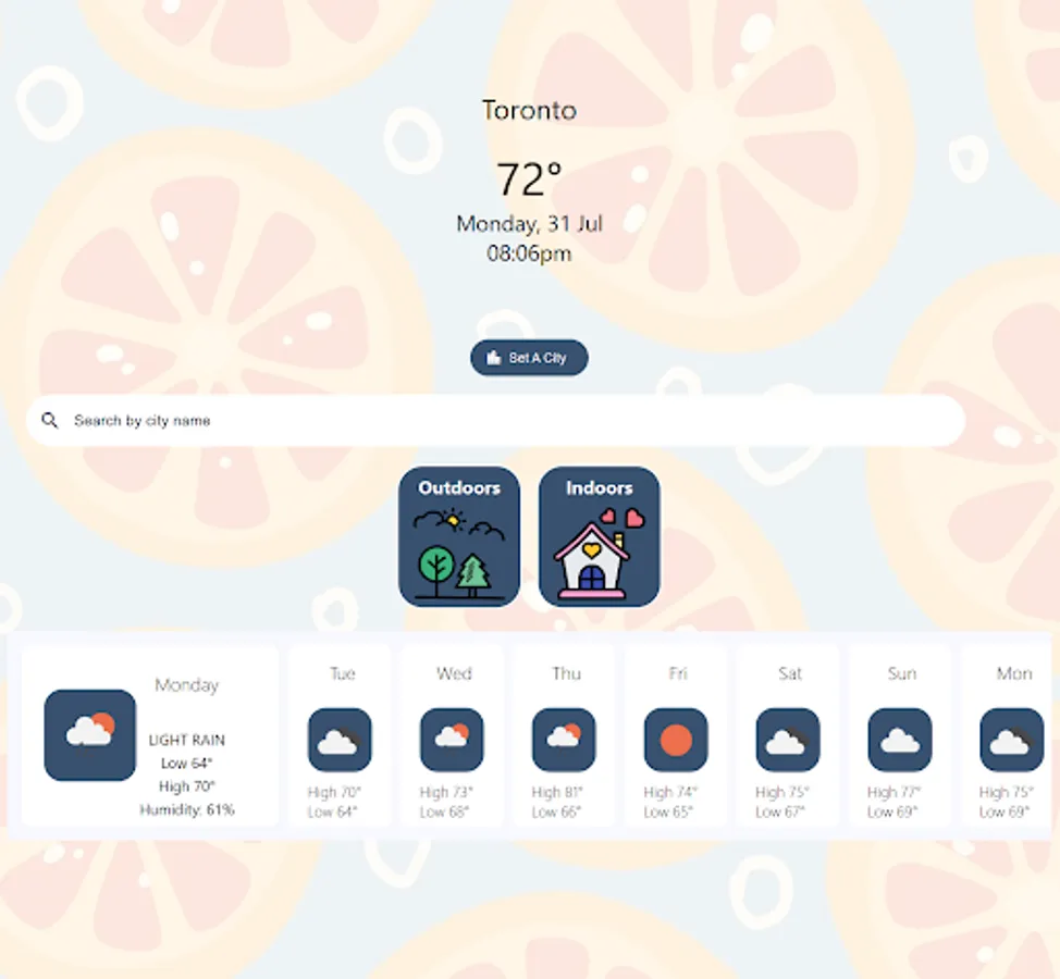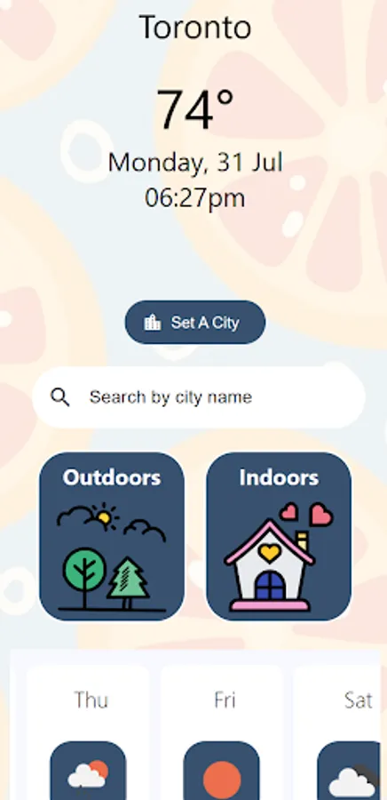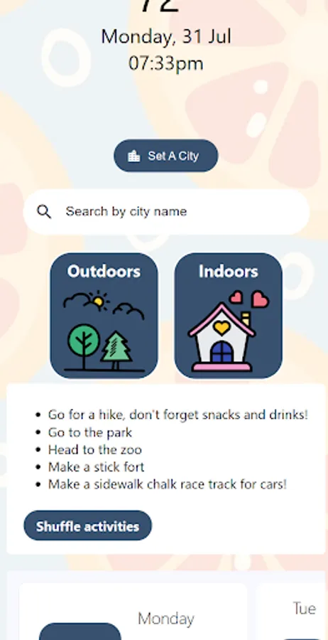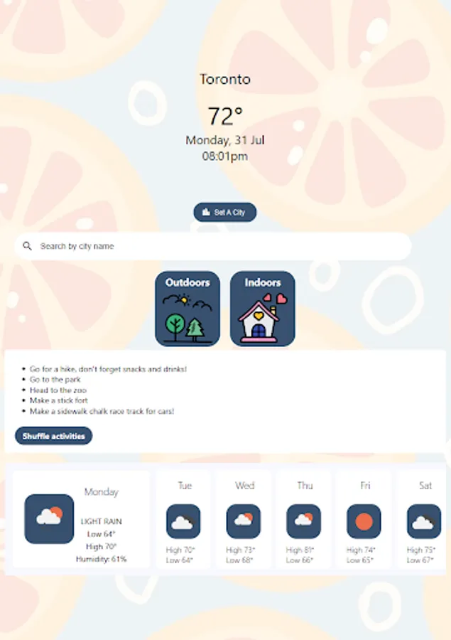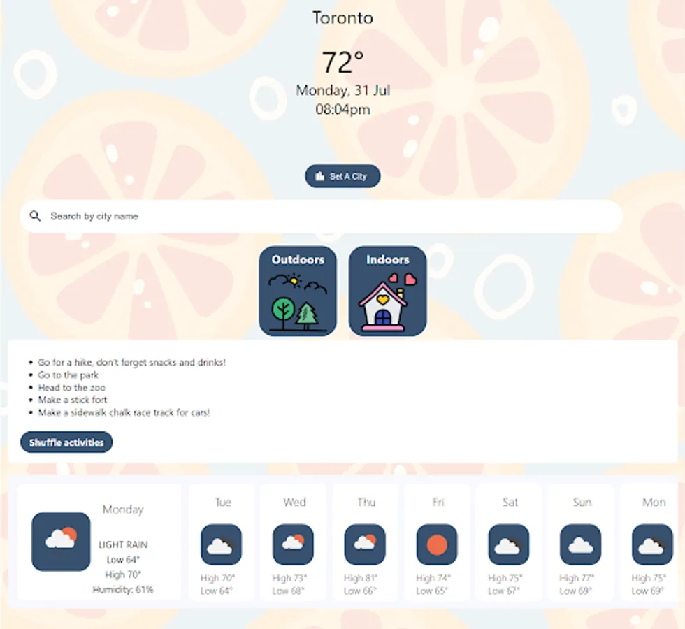 Have you ever planned a day of play outside that got interrupted by bad weather? Now what? Not sure what to do on a sunny, hot day? Let Kiddie Cast help you decide! Check the weather for your area, and then shuffle the activity list until you find something to do that you like. Keep your family playing together-no matter the weather!