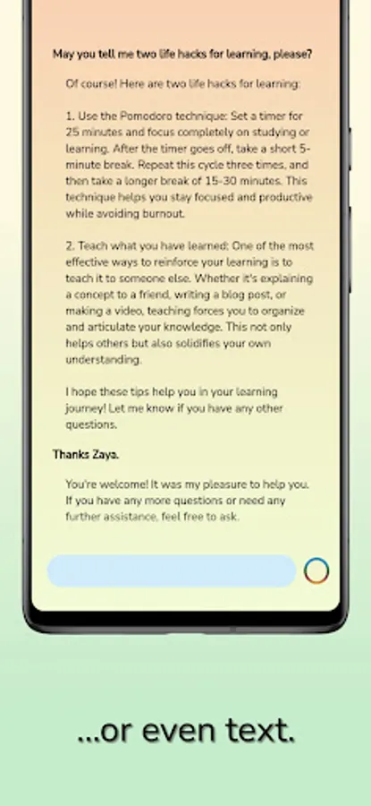 Designed using the state-of-the-art AI architecture, Zaya boasts a comprehensive understanding of a wide array of subjects. It can engage in intricate discussions across diverse topics, from scientific concepts to literature, offering you a knowledgeable conversation partner.