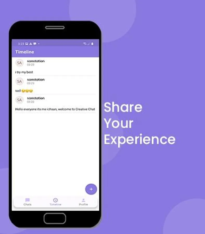 Creative Chat App is Simple Chat application that you can interact each other, you can create group chat, and send timeline. You can see stranger timeline too, so download it now