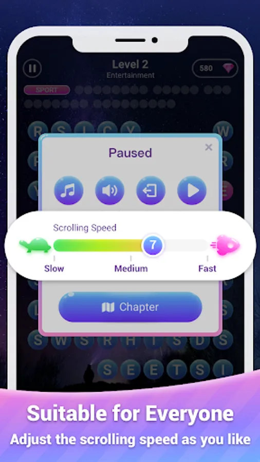 Unlike other word games, the great challenge for you in Scrolling Words Bubble is to find all target words according to the clue from scrolling letters. Countdown and the scrolling speed also increase your challenge difficulty.
