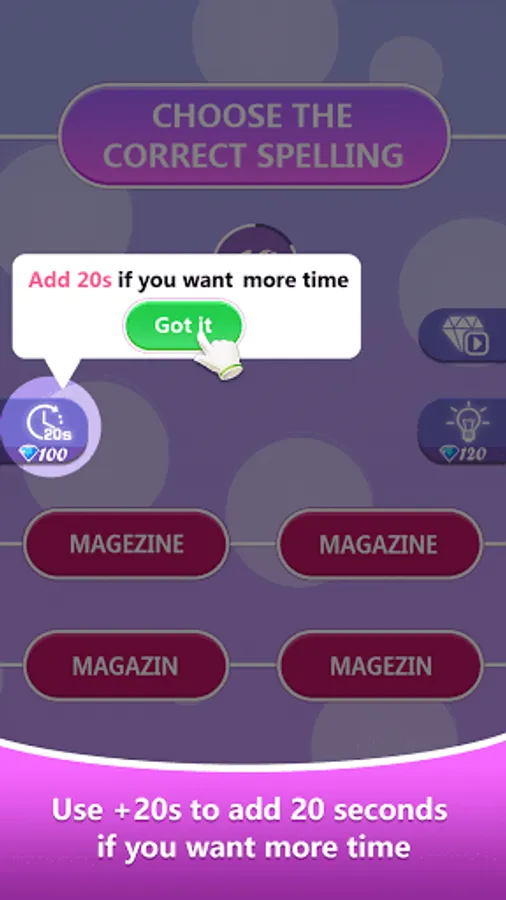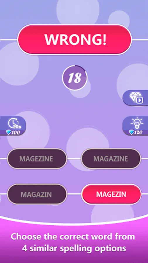 The great challenge for you in Word Spelling is to find the correct word from 4 similar spelling options. Countdown will increase your challenge difficulty.