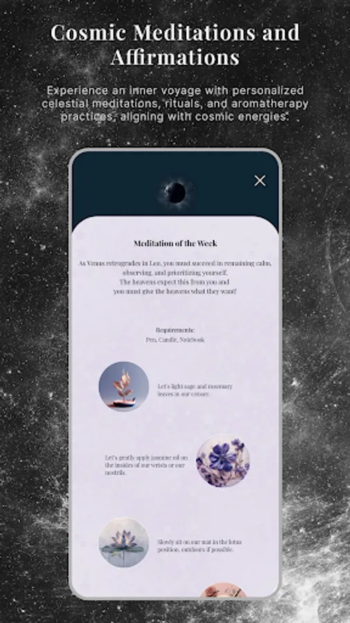 Embrace the celestial influences from your birth chart and receive guidance through meditations, rituals, aromatherapy and wellness practices that encourage a deeper connection with the cosmos.