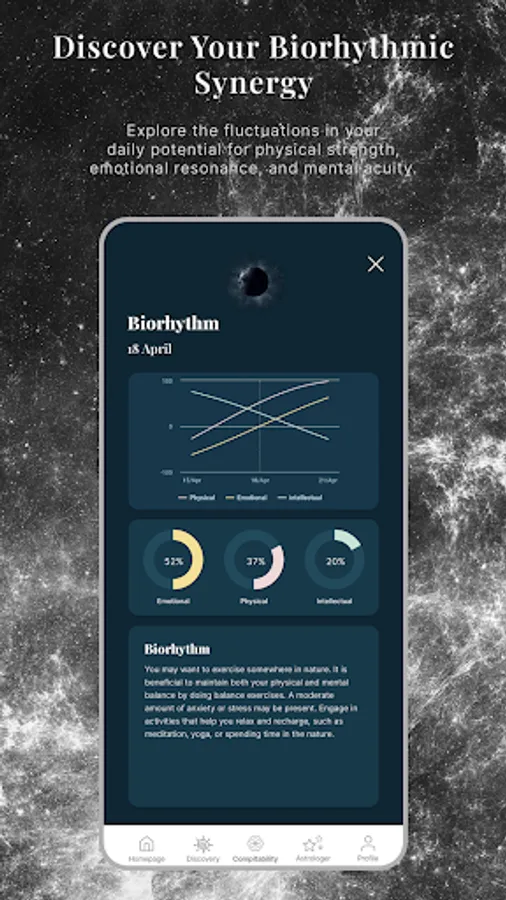Discover the daily fluctuations of your physical strength, emotional resonance and mental sharpness with Celestial Biorhythm Analysis. Astopia uses Celestia's wisdom and advanced algorithms to calculate your biorhythm cycle by date of birth, helping you tune into your inner energy and mood level at any given moment. Embrace harmony with your body and optimise your productivity on your journey through this cosmos.