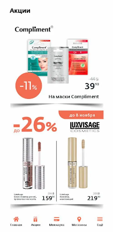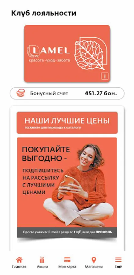 The mobile application of the LAMEL beauty chain store and Optima chain store is a convenient service, thanks to which you will always be up to date with current promotions, personal offers and hot new products! With it, you can track information about your bonuses, discounts and purchase history!