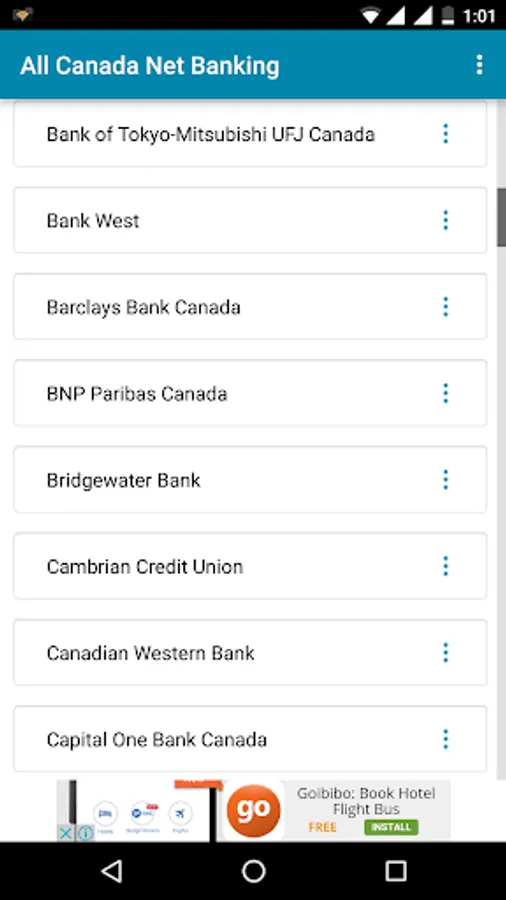 L'application vous permet d'accéder net bancaire de plusieurs banques canadiennes à un seul endroit. Il vous suffit de sélectionner votre banque et son site net bancaire va charger dans une application.