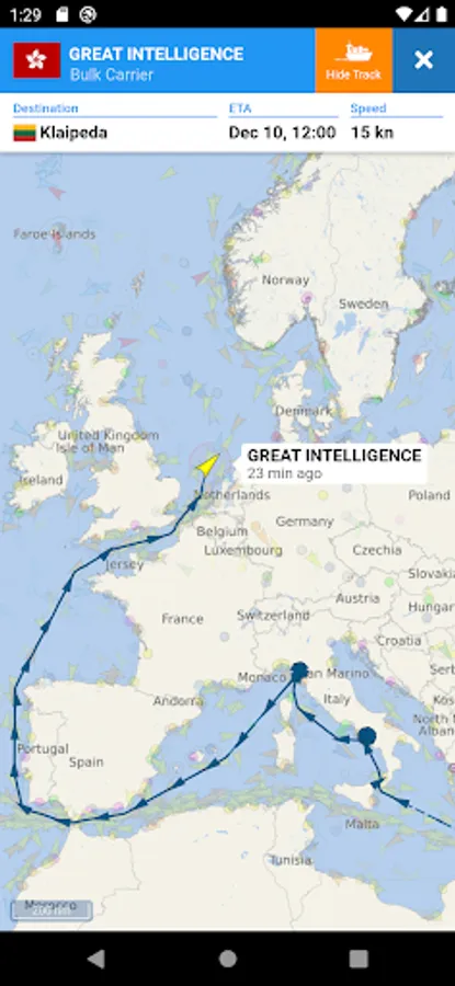 - Ship details - name, flag, type, IMO, MMSI, destination, ETA, draught, course, speed, gross tonnage, year of built, size and more