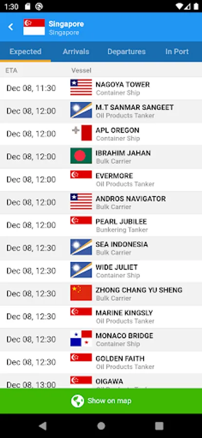 - Port Calls per port – detailed list of all vessels Expected, Arrivals, Departures and currently In Port