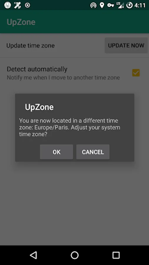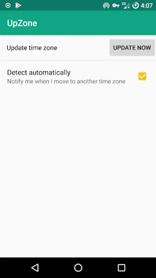 The Android's Automatic network-provided time zone doesn't always work. UpZone detects your time zone based on your current location using GPS/Network/Wi-Fi. One can check for the current time zone manually or let the app monitor location changes silently. The app will suggest a time zone change if necessary.