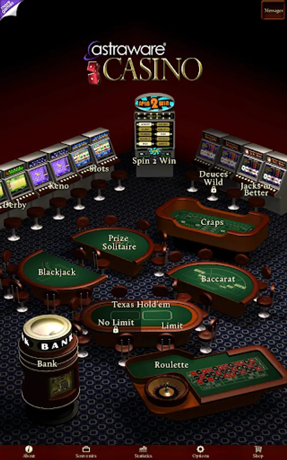Like a regular vacation, when it's fun to bring back souvenirs, Astraware Casino gives you your own Souvenir Suitcase. As you play various achievements unlock different items to go in the suitcase to remind you of your trip to the Astraware Casino!